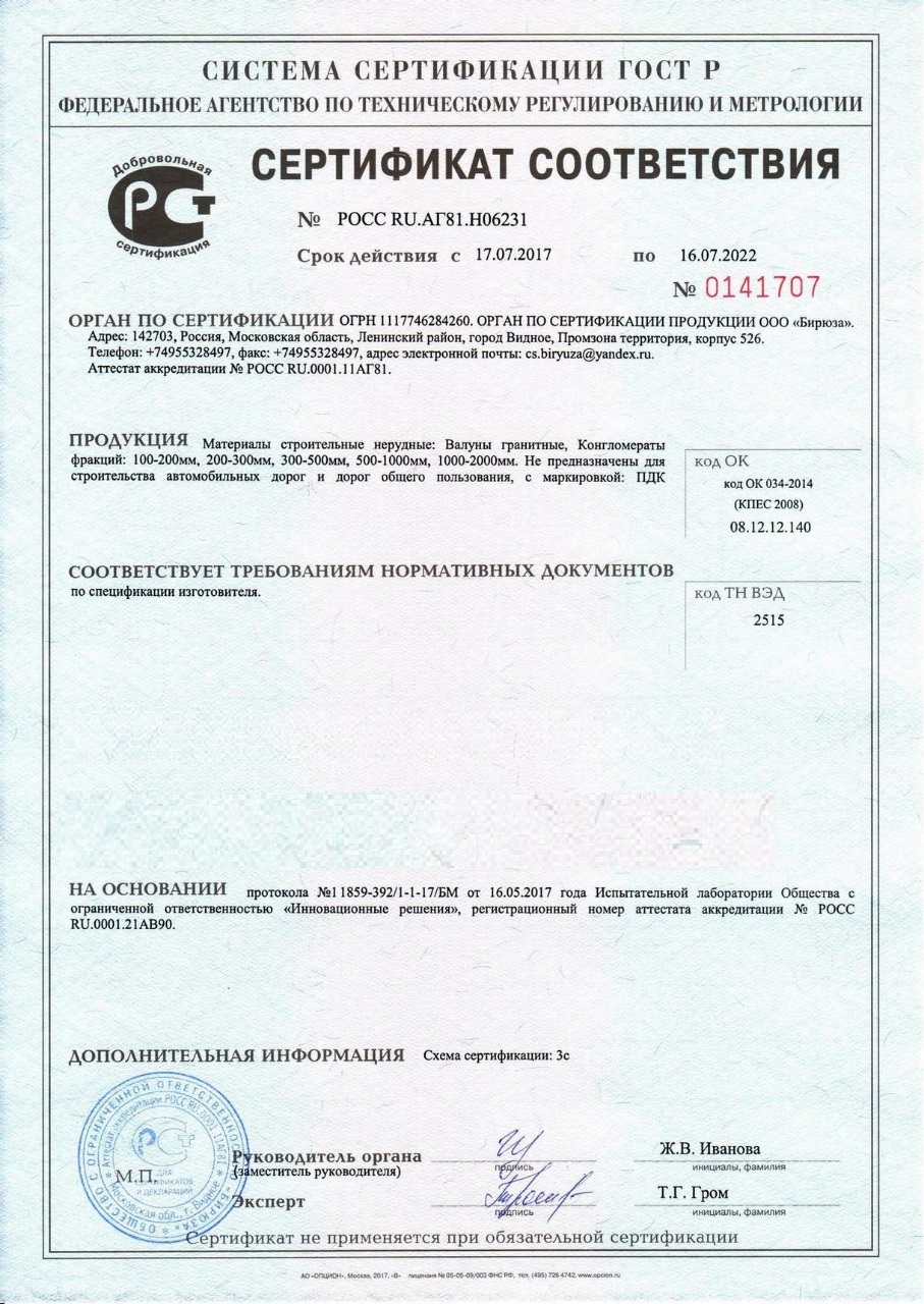 Сертификат соответствия – документ, подтверждающий соответствие продукции требованиям качества и безопасности, установленными для нее действующими стандартами и правилами. Наш камень, который Вы сможете заказать с доставкой в Орле , обладает всеми необходимыми документами для реализации и при необходимости могут быть предоставлены все необходимые подтверждающие документы при поставке.